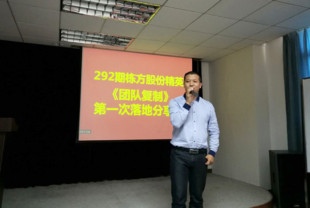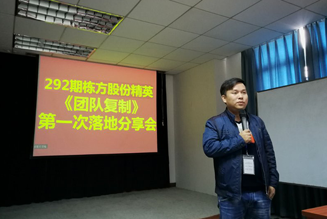 2017年11月23日,棟方股份精英《團(tuán)隊復(fù)制》第一次落地分享會在公司員工培訓(xùn)室舉行,與會人員除公司邱副總經(jīng)理、黃副總經(jīng)理、人事行政中心胡總監(jiān)及各精英團(tuán)隊負(fù)責(zé)人之外,還有幸邀請到聚成金牌講師李經(jīng)理一行蒞臨指導(dǎo)。