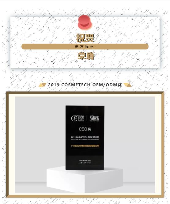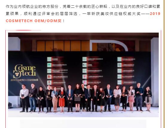 祝賀棟方股份榮獲全球美妝供應(yīng)鏈權(quán)威大獎——2019 COSMETECH OEM/ODM獎